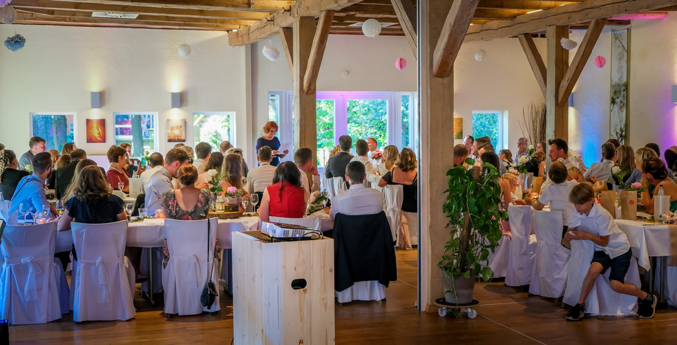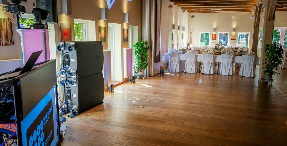 Es war ein sehr heißer Sommertag, als ich am Lüßmanns Hof mein Equipment für die Feier von Jasper und seiner Braut aufgebaut habe. Gefühlt waren es 40 Grad im Schatten. Als ich den Saal für die Feier betreten habe, um meine Technik aufzubauen habe ich sofort die Klimaanlage schätzen gewusst. Ich dachte nur "Gottseidank eine Location mit Klimatisierung". Der Raum ist zwar nicht riesig, doch völlig ausreichend für 50-80 Personen.